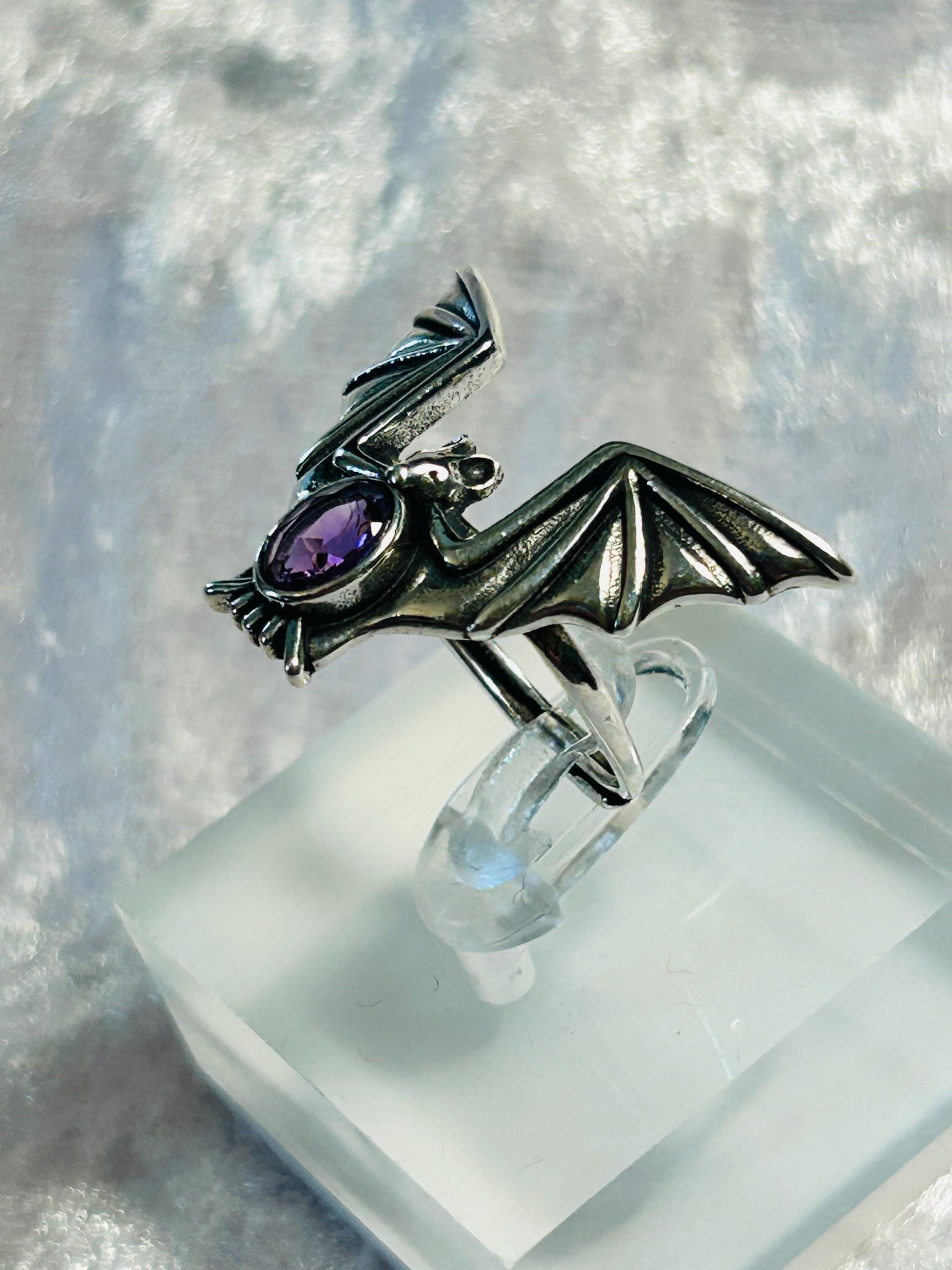 1 x Unusual .925 Silver Adjustable Bat Design Ring With A Beautiful Amethyst Crystal - Supplied With Gift Box.