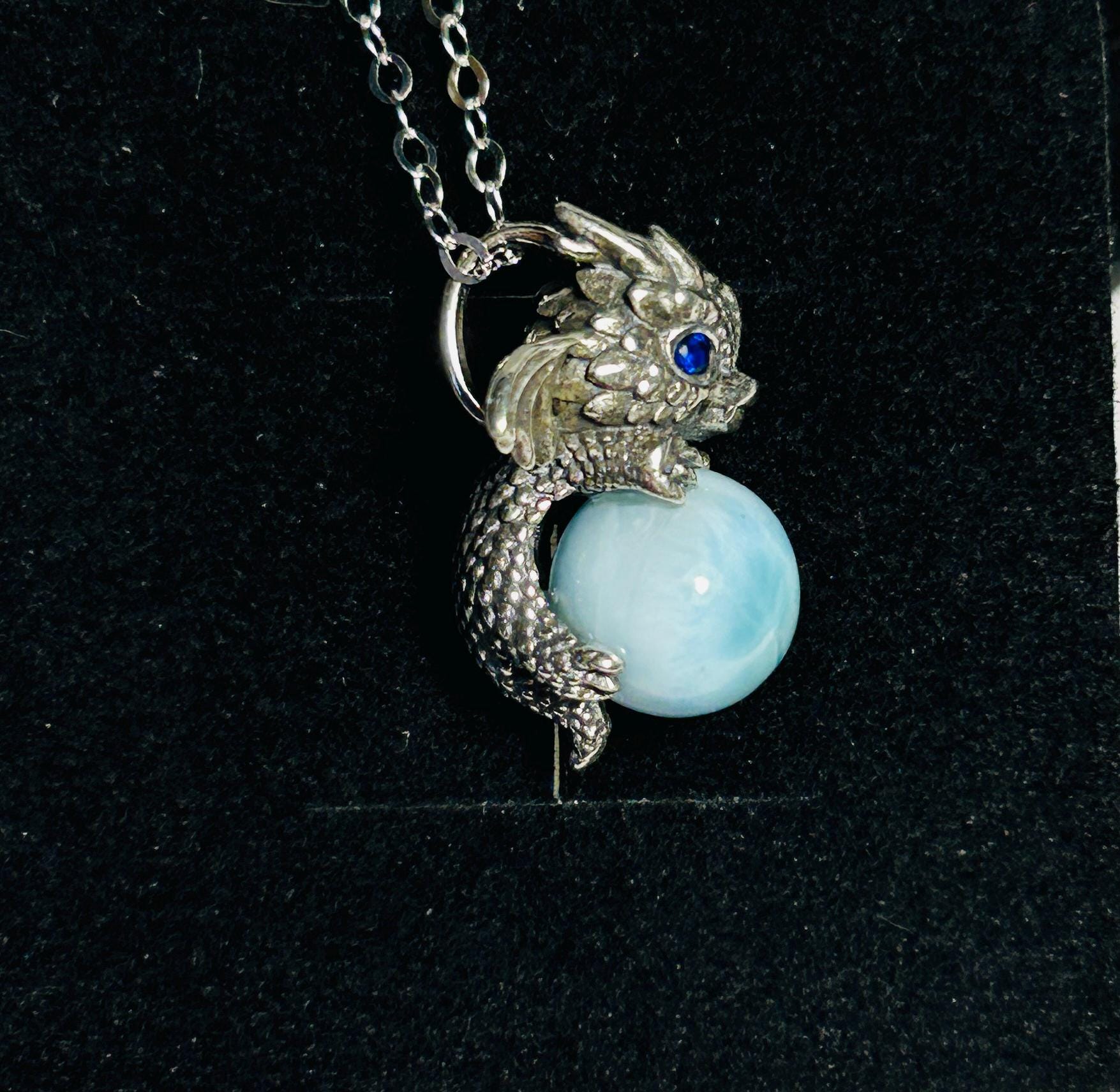 Stunning Baby Dragon Pendant Made Of 925 Silver With Larimar Sphere Gemstone.