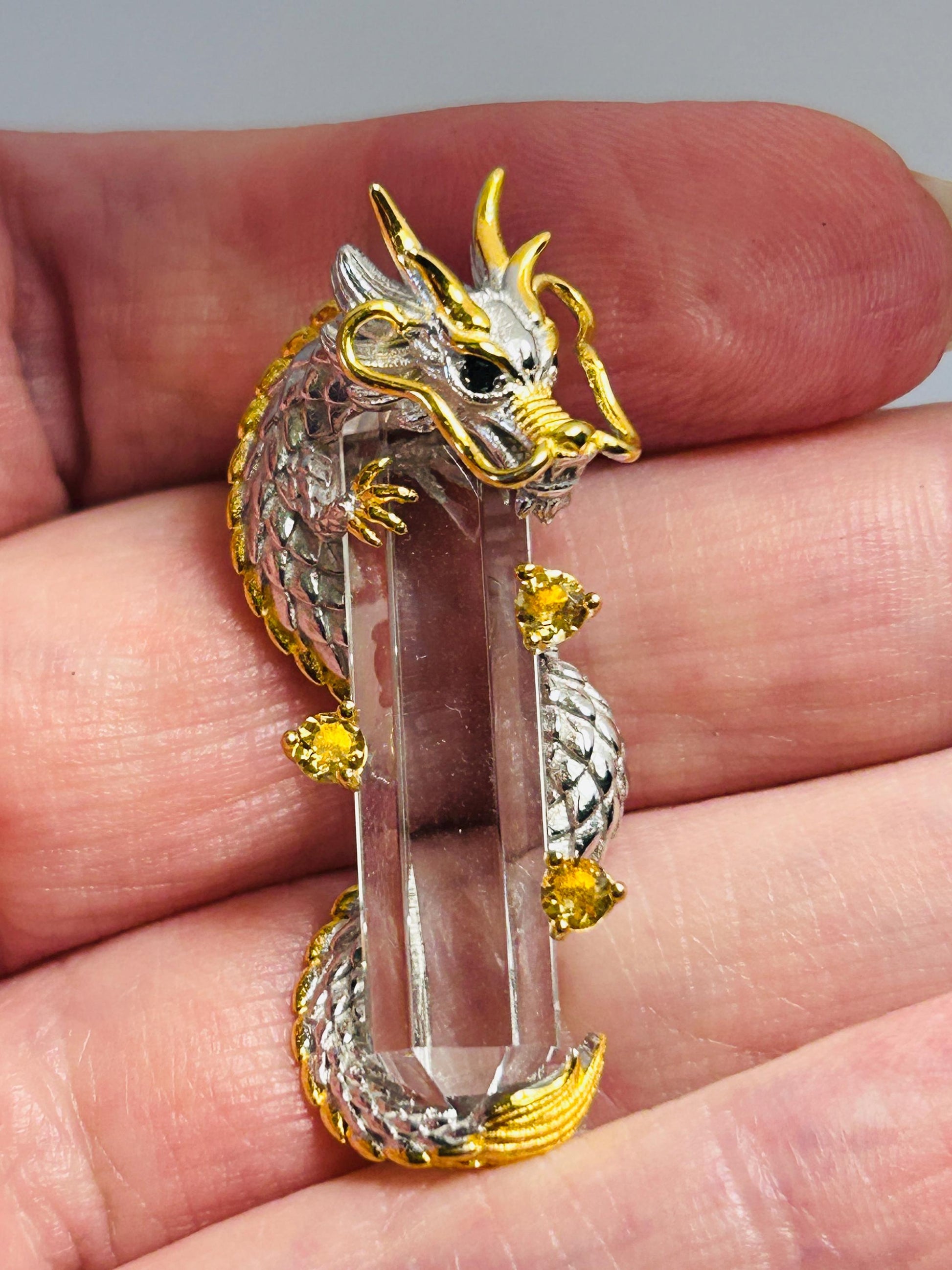 High Detailed Dragon Pendant With Prong Set Citrine Gemstones & Wrapped Around A Clear Quartz Crystal Point - Supplied With Gift Box.